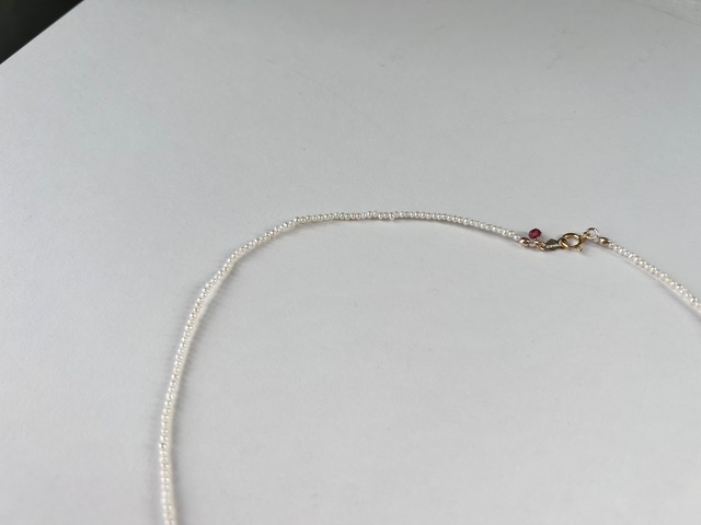 KAMIORI KAORI .小さな淡水パールのネックレス。 金具には小さな赤い石。 少し短めに鎖骨のあたりに沿うような長さに仕上げています。 s i z e : 全長約38cm(金具含む)。粒のサイズは、ものさし付きの写真をご参考にしてください。着用写真は、同じくらいの長さで製作したネックレスになります。粒の形が微妙に違いますので、長さのご参考にしてください。 m a t e r i a l : 淡水パール、金具-14KGF 商品は繊細なものになりますので、お取り扱いにはご注意くださいませ。 また引っかかり、装飾パーツの破損、引裂等にはご注意ください。