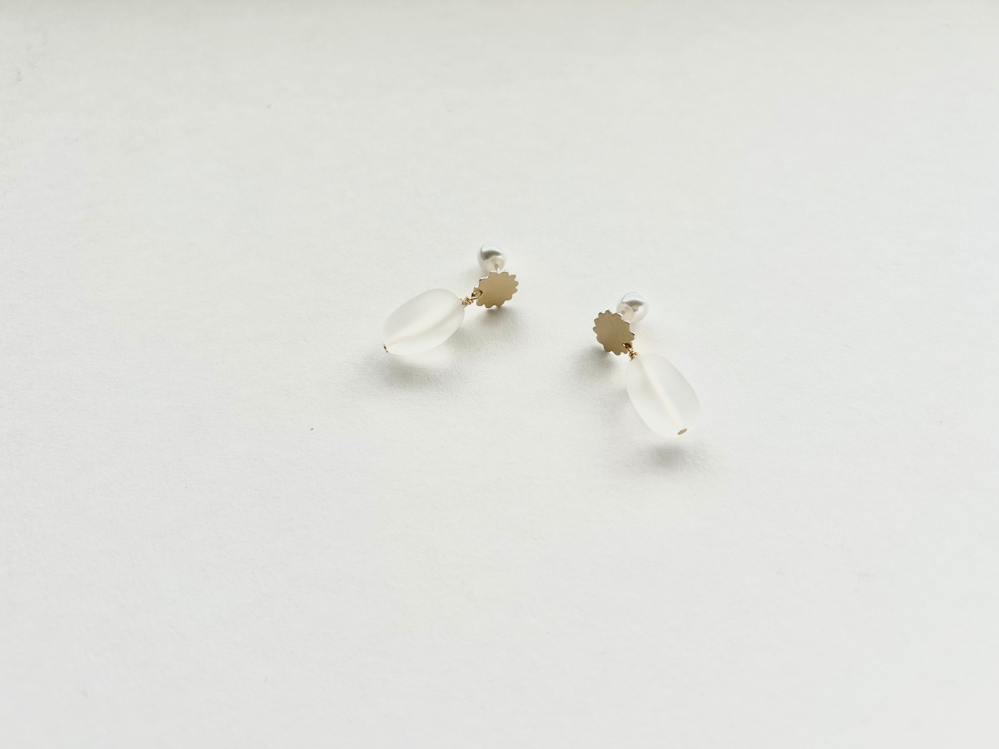 10金のフラワーモチーフにすりガラスのような雰囲気のクォーツのゆれるピアス。
